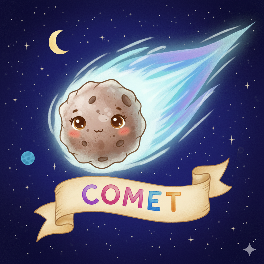 ¡Los cometas son como gigantescas bolas de nieve sucias que viajan por el espacio! Cuando se acercan al Sol, el calor los derrite un poquito y les crece una cola brillante y espectacular. ¡Busca «Cometas» en el cielo y podrás ver a estas estrellas fugaces heladas con su larga cabellera espacial!