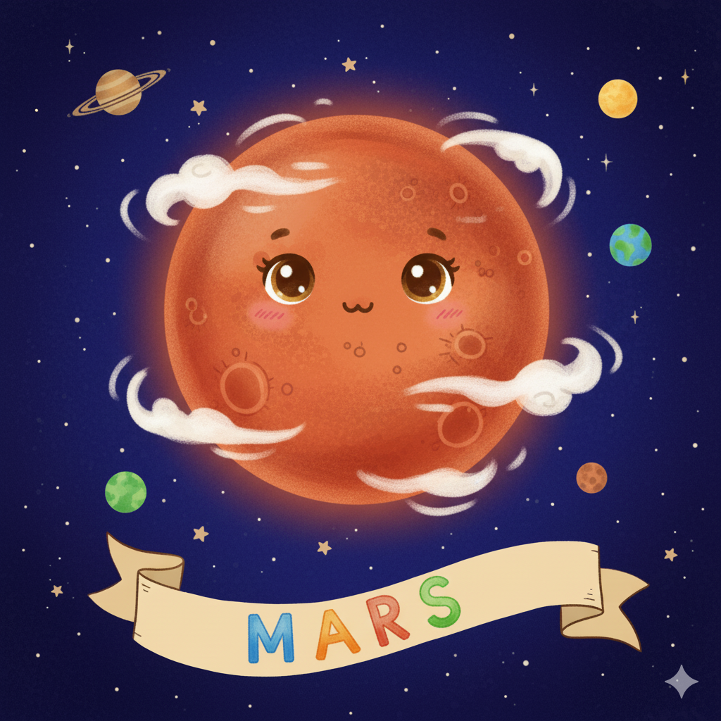 ¡Hola! Soy Marte, el Planeta Rojo. Me llamo así porque mi suelo tiene mucho óxido (como el de un clavo oxidado), ¡y eso me da un color genial! Soy el vecino de la Tierra y tengo dos lunas, Fobos y Deimos, que me acompañan. Aunque soy un desierto muy frío, tengo estaciones del año como tú. ¿Sabías que un día en Marte dura casi lo mismo que un día en la Tierra? ¡Ven a explorar mi superficie rocosa y mis volcanes dormidos!